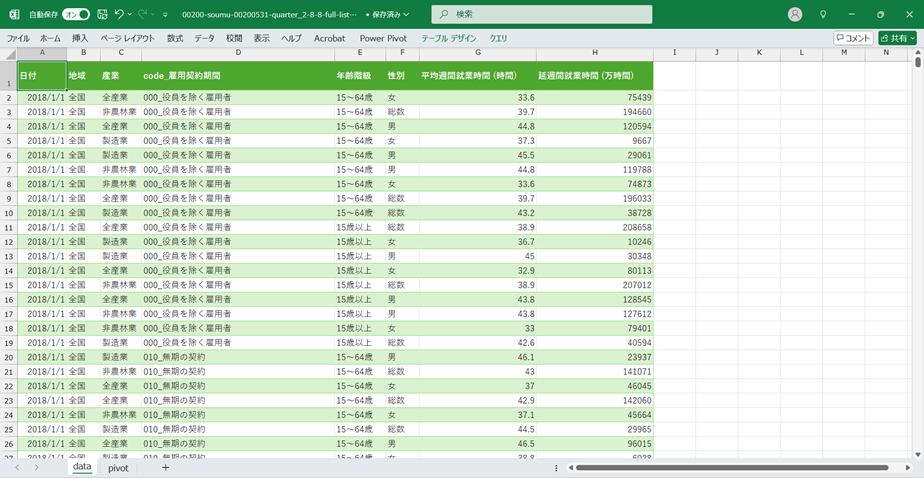 労働力調査_四半期_2-8-8_雇用契約期間別平均週間就業時間及び延週間就業時間 2018年Q1 - 2024年Q4 (列 - 複数値形式)(00200-soumu-00200531-quarter_2-8-8-full-listm.csv)