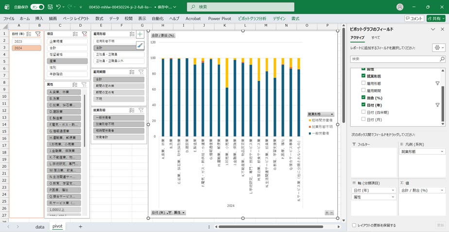 外国人雇用実態調査_事業所調査_表2_産業・企業規模・在留資格・性・年齢階級、雇用形態・就業形態別外国人常用労働者構成比_年次 2023年 - 2024年 (列指向形式)(00450-mhlw-00450224-ji-2-full-list.csv)