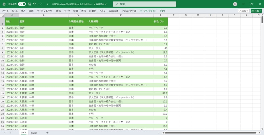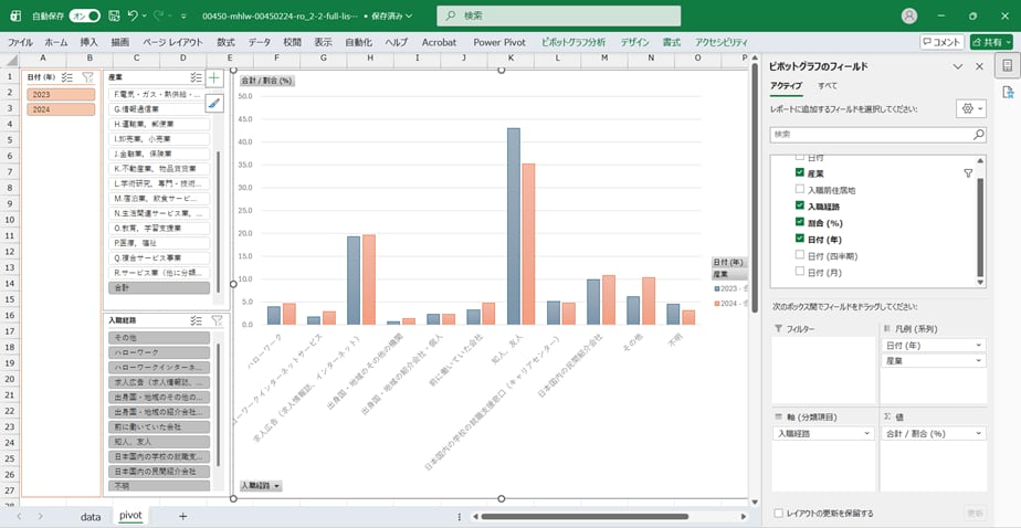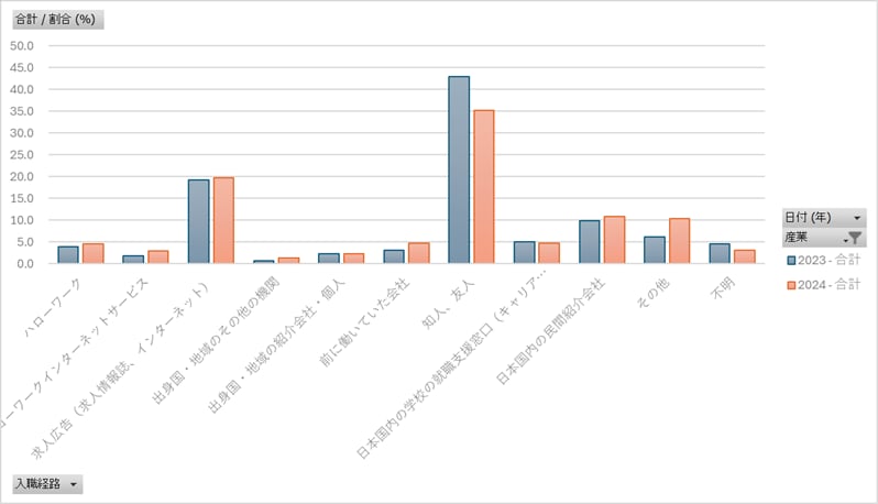 外国人雇用実態調査_労働者調査_表2-2_産業、入職経路別外国人常用労働者(入職前居住地:日本)構成比_年次 2023年 - 2024年 (列指向形式)(00450-mhlw-00450224-ro_2-2-full-list.csv)