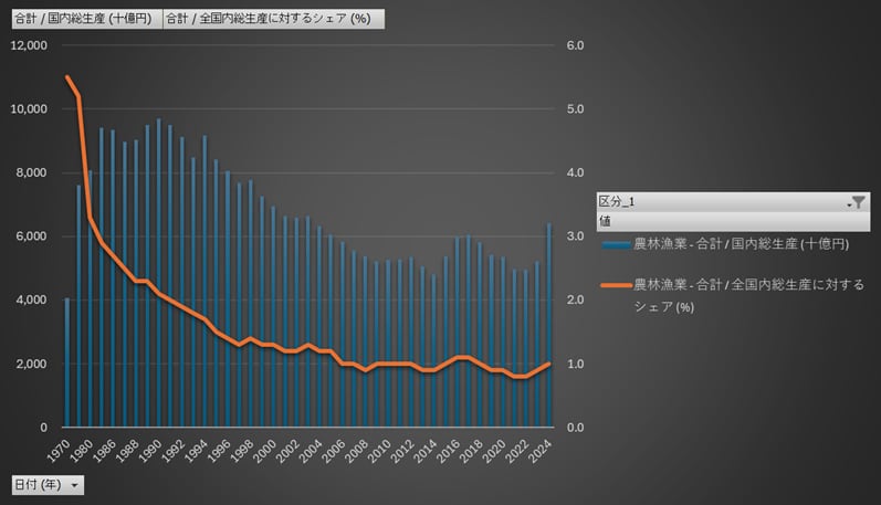 >農業・食料関連産業の経済計算_2020年基準_表1-1・2_国内生産額・国内総生産_年次 1970年 - 2024年 (列 - 複数値形式)