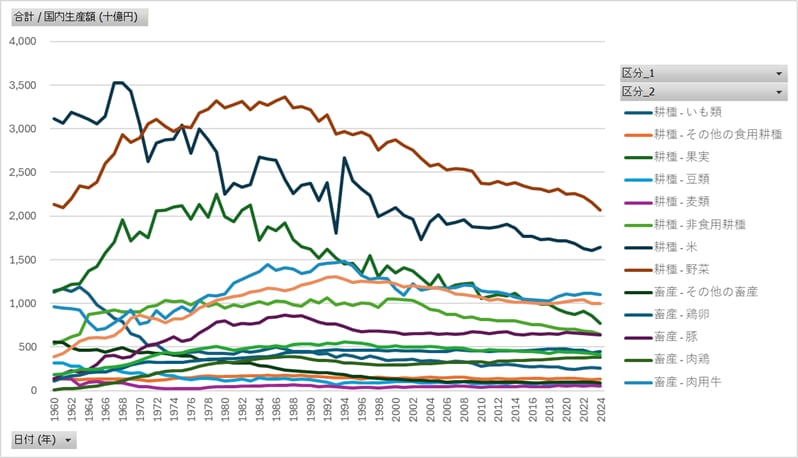 農業・食料関連産業の経済計算_2020年基準_表2-2_国内生産額_年次 1960年 - 2024年 (列指向形式)(00500-maff-00500001_b2020-hyo2-2-full-list.csv)