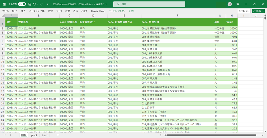 家計調査_貯蓄・負債編_表7010_用途分類(貯蓄・純貯蓄・負債現在高階級別)_年次 2005年 - 2024年 (列指向形式)(00200-soumu-00200561-7010-full-list.csv)